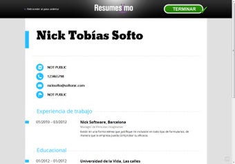 Experiencia profesional, conocimientos académicos, habilidades especiales... Parecen muchos datos a cumplimentar pero el proceso es muy rápido: en menos de 10 minutos habrás acabado y podrás ver cómo queda tu currículum con Resumesimo para luego imprimirlo, llevártelo en PDF o modificarlo siempre que quieras.